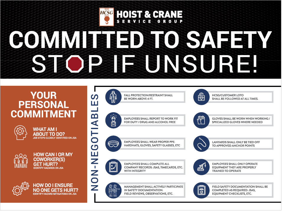New Orleans, LA – Hoist & Crane Service Group remains completely committed to the safety of our employees and customers. This month, our safety department unleashed a new initiative to drive home the importance of critical safety points in the day to day work of our service personnel. Our objective is to drive a culture of safety at HCSG and it starts with taking a zero tolerance position on shortcuts and a wholehearted focus on doing the job right and safely the first time.
